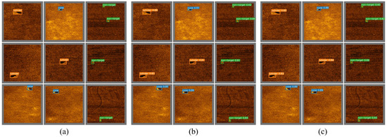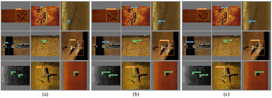 The experiments in this paper utilized both the publicly available STCD dataset [53] and a self-collected dataset for testing. The STCD dataset is a public sidescan sonar dataset that includes three categories: ship, aircraft, and human, with a total of 497 images. In this study, the number of samples was increased to 692 through data augmentation and the addition of new data. The dataset was then split into training, validation, and test sets in a 7:1:2 ratio for experimentation. Our self-collected dataset was acquired during ocean experiments using a dual-frequency sidescan sonar. This dataset comprises three categories: cylinder, cone, and non-target. After data augmentation using a diffusion model [54], it contains a total of 975 images. This dataset was also divided into training, validation, and test sets in a 7:1:2 ratio. The detailed sample numbers of the two datasets are shown in Table 3.