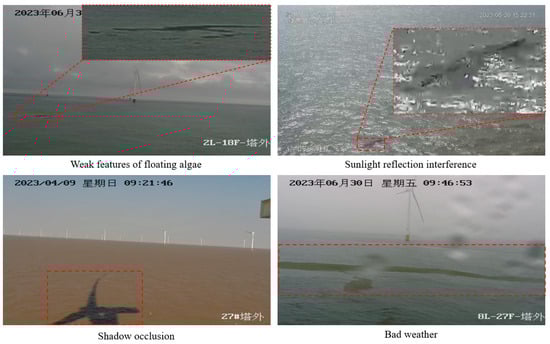 The widespread presence of floating algae (Ulva prolifera and Sargassum) in the East China Sea poses a serious threat to the marine ecological economy [,,]. Firstly, the dense growth of green algae obstructs the sunlight, impeding the photosynthesis of submerged organisms and thereby disrupting the marine food chain. Additionally, the extensive decay of floating algae leads to a notable deterioration of seawater quality, resulting in economic losses in coastal aquaculture. Consequently, real-time monitoring and an early warning system for coastal floating algae have become crucial in the development of the circular marine economy [,,,]. The outbreak of green algae, influenced by various factors such as sea breezes and ocean currents, exhibits significant randomness and fluidity in its distribution. Hence, the monitoring system must satisfy stringent requirements in terms of real-time responses, low deployment costs, and high detection accuracy. In comparison to obtaining images from remote-sensing satellites, synthetic-aperture radar, or unmanned aerial vehicles, surveillance cameras installed on ships and shores can offer more stable monitoring, faster responses, and lower application costs. In this paper, we focus on discussing the utility of surveillance RGB images in the algae monitoring task.