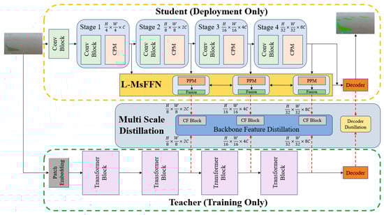 The above observations reveal several significant challenges in the original SCTNet structure. Firstly, even within the same category, the features of large-sized targets in the higher-level pyramid will overshadow the features of small-sized targets, resulting in missed segmentation. The multi-scale feature fusion structure can ensure the student network captures a more comprehensive representation of the floating algae data, thereby enhancing the overall performance. Secondly, the teacher network, which is based on the transformer structure, demonstrates superior performance in multi-scale modeling compared to CNN-based structures. This advantage arises from self-attention’s ability to model long-range dependencies. However, this multi-scale fitting capability is difficult for the CNNs to replicate. Finally, relying solely on the highest-level semantics for decoding has been proven inefficient in the algae distillation task. This design structure limits the distillation performance, particularly when dealing with targets that exhibit significant scale variations. The decoding features of the student network ought to incorporate multi-dimensional feature information, rather than solely relying on high-level semantics.