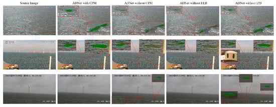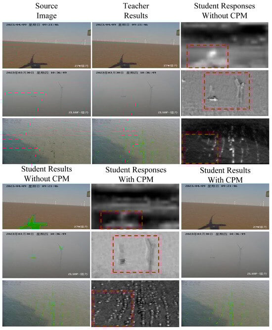 In this section, we will discuss the impact of CPM on the distillation process for floating algae recognition. To conduct a comprehensive analysis, we implemented the following comparative strategies: First strategy: we completely removed the CPM from the ADNet. Second strategy: we eliminated the feature enhancement branch (FEB) in the CPM. Third strategy: we removed the interference purification branch (IPB) from the CPM. Table 5 summarizes the comparative results obtained through these methods.