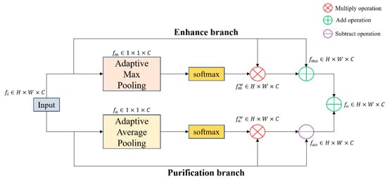 In the enhancement branch, the addition operation is employed to obtain the response weight , thereby amplifying the attention dedicated to algae targets in the feature map. Conversely, in the purification branch, subtraction operations are utilized to eliminate the background interference response from the input features, thereby mitigating the impact of interference on the representation of algae features. Finally, the and are combined through the weighted add operation ( and ) to yield the output of the CPM, denoted as . The entire process is expressed as follows: