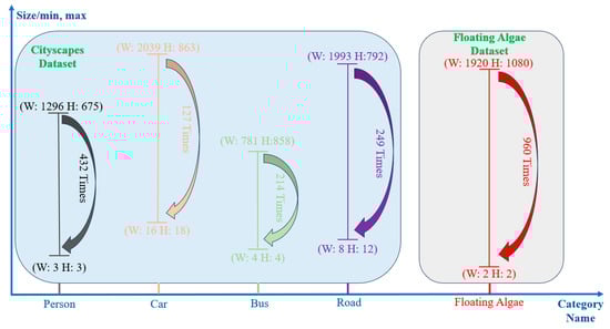 The efficacy of the segmentation model is intricately tied to its ability to handle multi-scale features. However, it is noteworthy that the student structure in the original SCTNet lacks this capability, posing a significant limitation in the algae segmentation task. To underscore this, we conducted a comparative analysis by computing the maximum and minimum sizes of selected categories in both the cityscapes dataset and our floating algae dataset, as depicted in Figure 6. The result reveals that scale differences within the same category are prevalent in different tasks, particularly in our algae category, where the discrepancy spans up to 960 times. Therefore, it is important to strengthen the feature fusion ability across diverse scales in our distillation structure.