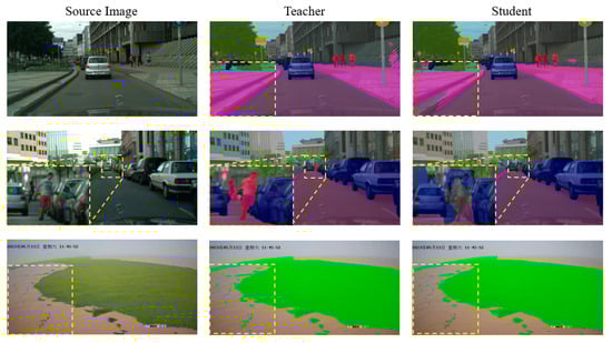 However, our ADNet still faces several challenges, particularly in the following aspects: Firstly, the performance of the teacher network directly influences the student network’s performance due to the distillation structure. Consequently, any incorrect knowledge embedded in the teacher network can be seamlessly transmitted to the student model without any filtering mechanism, ultimately leading to a decrease in the student’s performance. As illustrated in Figure 22, we visually compare the segmentation results of ADNet, Segformer, and OCRNet. These comparisons reveal that the teacher network’s misidentifications can directly contribute to the errors in ADNet. Conversely, traditional semantic segmentation models do not exhibit similar errors as their training solely relies on the truth-labeled samples. In our ADnet structure, we directly analyze the feature disparities between the teacher and student networks to regulate the student’s training behavior. However, this process not only captures the correct features but also incorporates the incorrect, harmful features from the teacher network. Meanwhile, ADNet introduces a purification concept that selectively models the interference and multi-scale features from the perspective of the student network. This purification concept can be further extended to facilitate the selective learning of teacher features during the distillation process. Therefore, we will explore a purification approach in our distillation structure that enables the student to discerningly acquire knowledge from the teacher.