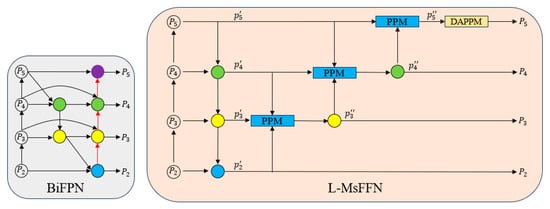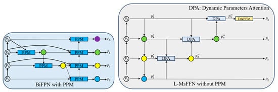 To this end, we propose the L-MsFFN; its structure is depicted in Figure 8. Firstly, we initiate a pruning process on the original BiFPN structure, selectively retaining only essential fusion branches to mitigate unnecessary computational overhead. The original BiFPN structure adopts a top-down, lateral jumping, and bottom-up design to maximize the involvement of each pyramid layer in the feature fusion process, enriching the multi-scale semantics. However, this densely connected nature also introduces redundant computations. Upon analyzing the impact of each fusion link in our algae distillation task, we observe that the lateral jump connections have a negligible effect on performance, rendering them unnecessary. Therefore, we eliminate these lateral skip connections in our L-MsFFN structure. A more detailed discussion about the skip connections will be presented in the experimental section. Additionally, we utilize the PPM as a replacement element for the DPA in the original BiFPN. This substitution aims to narrow the semantic gaps across different pyramid levels, thereby enhancing the effectiveness of the feature fusion process.