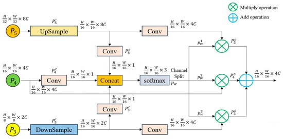 Here, represents the 2D convolutional operation. Afterwards, the , , and are concatenated together, and the softmax operation is applied to calculate the weight coefficients of different pyramid feature maps from the perspective of pixel dimension. The corresponding weight coefficients and on each pyramid scale can be obtained sequentially through the channel split operation.