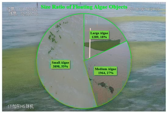 To evaluate the performance of ADNet, we collected RGB-image data from surveillance cameras between April 2023 and August 2023, situated in Nantong and Yancheng in the Jiangsu Sea area. The detailed locations of these surveillance cameras are presented in Table 2. The dataset comprises 4500 labeled RGB images (Ulva prolifera) with a resolution of 1920 × 1080. We partitioned 3500 images for training purposes, reserving 1000 for validation and testing. The distribution of floating algae sizes in the dataset is depicted in Figure 11. In practical applications, we utilize 16 channels of surveillance video data to perform real-time detection and monitoring of floating algae along the coast of Jiangsu.