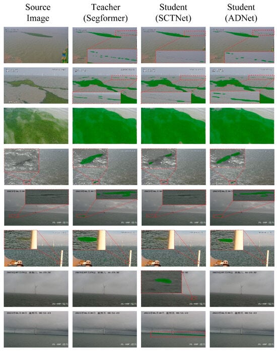 In scenarios 4, 5, and 6, the algae features are overshadowed by strong interference on the sea surface. This poses a significant challenge to networks, requiring them to effectively extract algae features amidst such strong interference. However, despite the Segformer network’s impressive performance, the student network of SCTNet still exhibits significant issues. Furthermore, in scenarios 7 and 8, the original SCTNet encounters severe false detection problems due to interference from similar color features on the sea surface. It indicates that the potent feature modeling ability of the teacher network fails to transfer its capabilities to the student network. Consequently, the limited modeling capability of the student hinders its performance in complex marine environments. To address this issue, we introduce the CPM, a module specifically designed to concurrently enhance algae features and reduce interference features. As presented in Figure 14, the student trained using our ADNet structure maintains a high true segmentation rate and a low false rate, even in scenes with strong interference, demonstrating its superiority in handling challenging marine scenarios.