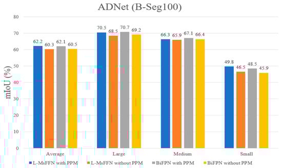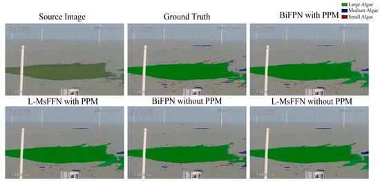 In a horizontal comparison between the L-MsFFN and BiFPN structures, it is evident that L-MsFFN exhibits superior performance in algae segmentation, particularly with its faster inference speed. Using B-Seg100 as an example, L-MsFFN manages to reduce inference speed by a noteworthy 7 ms while achieving a significant 1.7% improvement in the mIoU compared to BiFPN. Additionally, as depicted in Figure 17, a notable issue of missed segmentations arises when L-MsFFN lacks the PPM module. Meanwhile, when comparing L-MsFFN and BiFPN without PPM modules, we found that L-MsFFN exhibited a performance degradation of 0.3%. At the same time, we should note that adding skip connections for small algae targets resulted in a performance decrease of 2.7%. It indicates that skip connections have a beneficial effect on medium and large targets but have a detrimental effect on small ones. Furthermore, skip connections inflate the computational cost of the module, hindering real-time performance. Consequently, we made the decision to eliminate skip connections in our L-MsFFN structure, achieving a balanced trade-off between performance and speed.