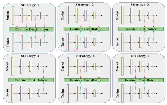 The original SCTNet structure employed feature maps from the top two pyramid layers for knowledge distillation, whereas our proposed ADNet utilized the last three layers. In this section, we will discuss the impact of various pyramid distillation levels on distillation performance. To achieve this, we conducted a comparative analysis involving six distinct distillation structures, as shown in Figure 18, and the results are summarized in Table 8. Through these evaluations, we aim to gain a deeper understanding of the factors that may influence the effectiveness of algae distillation.