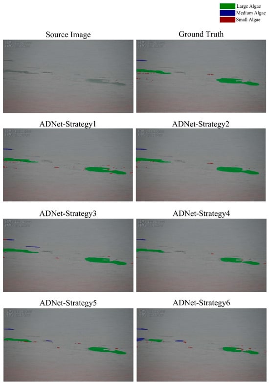 In contrast to previous strategies that emphasized distillation of high-level features, Strategies five and six prioritize learning low-level features. These approaches relinquish the guidance from teacher networks on higher-level semantics. However, this shift results in a significant decline in performance, as presented in Table 8. Taking ADNet as an example, strategy 6 exhibits a notable 6.8% decrease in the mIoU compared to strategy 2. Furthermore, despite the distillation network’s focus on learning low-level features, the segmentation performance for small-sized algae also suffers a 9.3% decrease in the student network. Figure 19 illustrates numerous false segmentations under Strategies five and six, leading to a significant reduction in the mIoU metrics. This proves that an exclusive focus on low-level pyramids has an adverse impact on the efficiency of algae distillation. It becomes evident that a high-performance distillation strategy should effectively capture both low-level details and high-level semantics in the algae distillation task. Therefore, in our ADNet, we opt for strategy 2 as the implementation method, as it can achieve superior performance.
