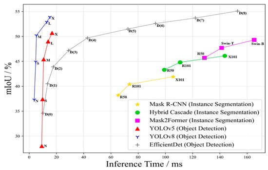 In previous research, methods such as object detection, semantic segmentation, and instance segmentation have been widely employed to detect algae targets on the sea surface. In Figure 20 and Figure 21, we present a comparison of performance and speed disparities among these methods. For object detection and instance segmentation, we utilize the COCO dataset, while semantic segmentation is evaluated using the cityscapes dataset. The comparison results reveal that instance segmentation methods do not exhibit advantages in terms of either performance or speed compared to object detection methods. Meanwhile, semantic segmentation models, which focus on segmenting targets within the same category, can offer faster speeds and superior performance compared to instance segmentation methods. Meanwhile, the speed of semantic segmentation approaches can achieve approximately 20 frames per second (FPS) faster than instance segmentation theories. Consequently, semantic segmentation techniques have emerged as the preferred choice for the current floating algae detection task.