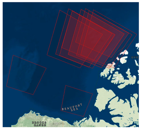 Considering the potential of lead growth, we chose the Beaufort Sea, located in northwestern Canada, as our study area, which is one of the most active Arctic lead areas [25]. Sentinel-1 dual-polarized, HH and HV, SAR images in extra-wide-swath mode at medium resolution are used as data sources. They are freely accessed from the Copernicus Open Access Center (https://scihub.copernicus.eu (accessed on 20 May 2021)). Since the sea ice movement and fracture during the Arctic winter and spring can promote the formation of leads, we collected a total of 10 SAR scenes of the Beaufort Sea from April to May and November to December from 2020 to 2022. The spatial distribution of these views can be seen in Figure 1, and the image information is shown in Table 1.