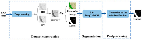 The workflow of sea ice lead detection in this paper consists of three main steps: dataset construction, image segmentation, and postprocessing. The flowchart of the lead detection workflow is shown in Figure 2. For given raw SAR data, dataset construction includes steps such as data preprocessing, extraction and fusion of dual-polarization data, and label generation. In the segmentation stage, we input the constructed dataset into our proposed segmentation network, SA-DeepLabv3+. Through the SA-DeepLabv3+ model, we obtain preliminary segmentation results for sea ice leads. Finally, we perform post-processing on the preliminary segmentation results. The postprocessing steps involve filtering operations to remove potential erroneous segmentations, fine-tuning, and optimization of the segmentation results to obtain the final ice lead detection results. Through this process, we can effectively and accurately detect ice leads from SAR images, providing crucial support and assistance for polar research and navigation.