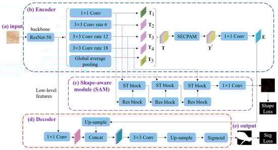 The overall structure of the proposed SA-DeepLabv3+. (a) Input: three-channel pseudo-color SAR images; (b) Encoder, enhanced by the proposed squeeze-and-excitation channel-position attention module (SECPAM); (c) Shape-aware module (SAM), composed of shape and texture integration blocks (ST block) and residual blocks (Res block); (d) Decoder; (e) Output: binary maps with white for lead and black for sea ice.