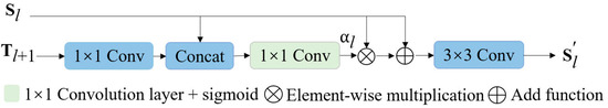 where R(·) denotes the Res block; denotes the output of the ST block; denotes the lth SAM feature maps; and represents the different scale semantic features from the encoder. The ST block, shown in Figure 6, fuses the semantic and shape feature maps, which can be expressed as follows:
