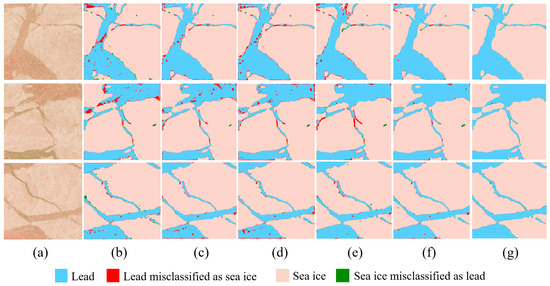 Visualized results of different lead detection models on the three subregion SAR images from the test set. (a) the pseudo-color SAR images; (b) results of TransUNet; (c) results of U-Net; (d) results of DeepLabv3+; (e) results of EW-Net; (f) results of CL-Net; (g) results of SA-DeepLabv3+.