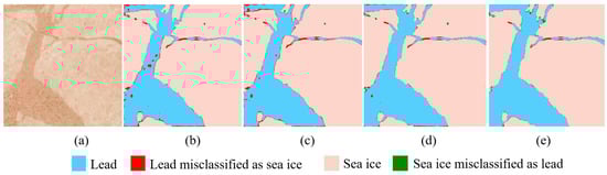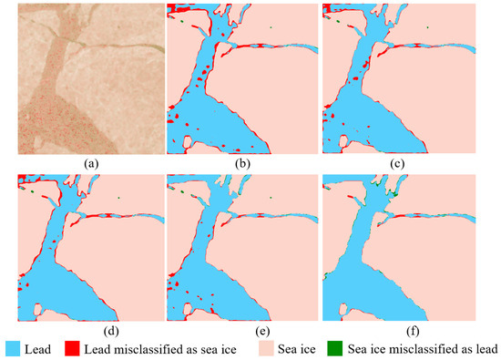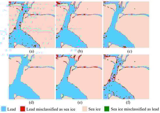 To investigate the impact of different polarization data on lead detection, we evaluated the model performance using combinations of HH and HV polarizations as input. The quantitative experimental results are presented in Table 5, while the visual segmentation results are depicted in Figure 11. From the comparisons, it can be concluded that the combined use of dual-polarization data can compensate for information deficiency when single-polarization data are used alone, enabling the model to learn more and improve segmentation accuracy. This is evident in the segmentation results, where compared to Figure 11a,b, fewer pixels of leads are misclassified as sea ice pixels in Figure 11c. Additionally, adding HH × HV as input enhances segmentation performance, as shown in Figure 11d. The model’s segmentation performance is optimal when the fused data are incorporated, with leads exhibiting complete contours and significantly reduced internal hole phenomena. Conversely, adding HH/HV results in a decrease in all indicators, as depicted in Figure 11e, where numerous misclassified pixels appear at the edges of leads. This could be attributed to the exclusion of high wind speed effects during dataset construction, selecting only SAR data under low wind speed conditions, thus favoring HH × HV for lead detection and potentially introducing interference and misclassification with HH/HV. Furthermore, incorporating data from all channels leads to the lowest segmentation accuracy, as reflected in Figure 11f, where leads lose their original shapes, and numerous pixels of the lead are misclassified as sea ice pixels. It is evident that more information does not necessarily lead to better segmentation results; only the addition of data conducive to lead detection can enhance segmentation accuracy.