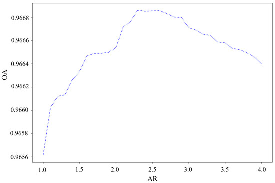 In order to ensure that the detected areas correspond to leads that meet certain length and width requirements, postprocessing operations are necessary. We calculate the aspect ratio of the detected lead using the minimal bounding rectangle, and areas with an aspect ratio below a certain threshold (AR) are filtered out from the results. We explore the effect of different AR values ranging from 1.0 to 4.0 on the algorithm. As shown in Figure 12, the segmentation accuracy initially increases and then decreases as the AR value increases. After conducting a thorough analysis, we have determined that a threshold AR value of 2.2 yields the best results. This value strikes a balance between capturing leads with the desired length and width requirements while maintaining high segmentation accuracy.