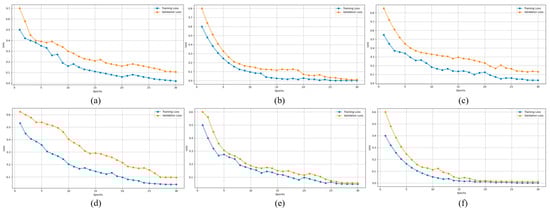 The variation of training–validation losses for different segmentation models. (a) TransUNet; (b) U-Net; (c) DeepLabv3+; (d) EW-Net; (e) CL-Net; (f) SA-DeepLabv3+.