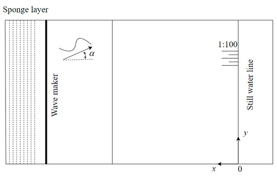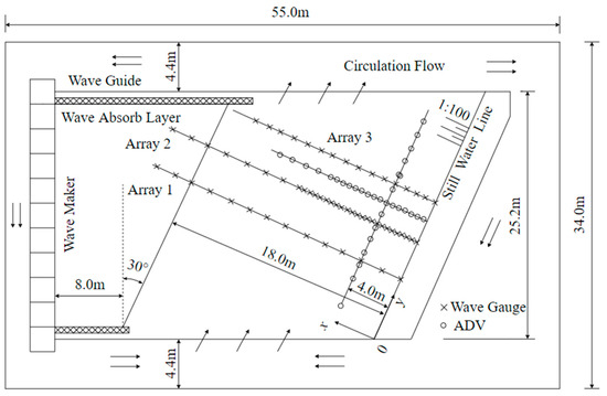 The experiments outlined by Shen et al. [9] were carried out in the State Key Laboratory of Coastal and Offshore Engineering of Dalian University of Technology. The wave pool was 55 m long, 34 m wide, and 1.0 m deep. The topography in the experiment was at an angle of 30°. The distance between the wave maker and the foot of the slope was 8 m, the length of the topography was 18 m, and the water depth at the planar bottom was 18 cm. Waves were obliquely incident on the coastline, forming a 30° angle with the direction of incidence to generate coastal currents. The length of the waveguide walls was arranged on both sides of the wave generator, and a sponge layer was placed on the inner side of the waveguide wall to prevent wave reflection. A distance of more than 3 m above the still water line was left to provide sufficient wave climbing length. The coastal topography had a 4.4 m interval from the surrounding pool walls, and its water depth was consistent with the water depth at the planar bottom. The origin of the plane coordinate system (x, y) was at the upstream end of the still water line, with the positive x-axis pointing offshore and the positive y-axis pointing downstream. The experimental layout is shown in Figure 1.