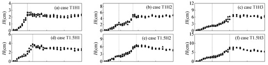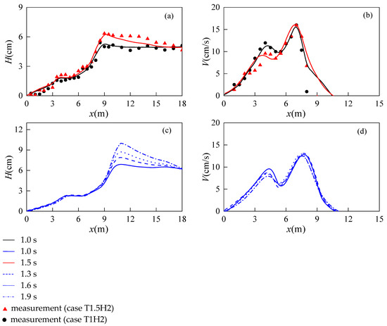 In order to study the influence of wave period on wave height and longshore current velocity, this section discusses two sets of wave conditions with similar wave heights: T1H2 and T1.5H2. Due to the fact that the wave heights in the experimental results are not exactly the same, the experimental wave height of 5.95 cm is also given here for the analysis of the numerical simulation results with periods of 1.0 s, 1.3 s, 1.6 s, and 1.9 s to study the influence of different wave periods.