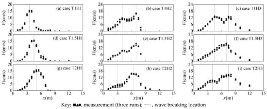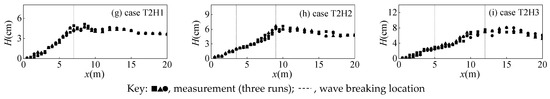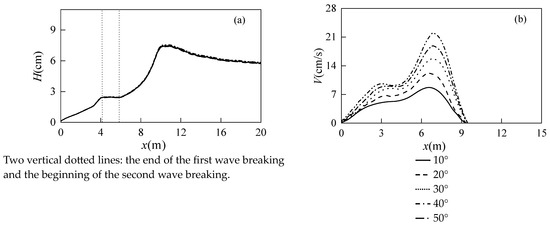 This section presents the experimental results of the 1:100 slope obtained by Shen et al. [13] and points out the case of two wave breaking phenomena that appeared in the experimental results. Figure 2 shows the wave height distribution. The location of wave breaking was marked by vertical dashed lines in the figure. It can be seen from the figure that two wave breaking phenomena occurred in some cases. The wave height in these cases did not always decrease; rather, it decreased to a certain location and then remained constant until the wave broke again, and the wave height continued to decrease until reaching the coastline. Figure 3 shows the distribution of the longshore current velocity. The location of the longshore current velocity peak is marked by the vertical dashed line in the figure. It can be seen from the figure that there are two distribution shapes of longshore current velocity. When the incident wave height is small, the longshore current velocity presents an unimodal distribution. When the incident wave height is large, the longshore current velocity presents a bimodal distribution.