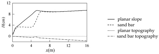 To verify the applicability of this model to different slopes, this section contains the numerical simulations relating to a planar slope beach topography with different slopes and presents a comparison of the computational results of this model with the results obtained by Yan et al. [10] using a wave averaging model. The wave conditions considered here are regular waves with a depth of 5 m, a period of 5 s, an incident wave height of 1.0 m, and slopes of 1:150, 1:300, and 1:500, respectively. The spatial steps are and , and the time step is .