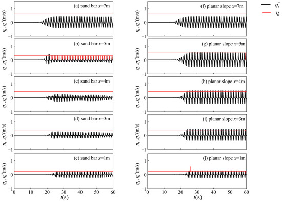 The application of the above-mentioned wave breaking method can be used to judge two wave breaking phenomena on sand bar topographies due to the fact that wave recovery occurs on sand bar topography and no wave recovery occurs in the case of gentle planar topographies. To illustrate this point, take a 1:40 slope, T = 1.0 s, H = 9.5 cm, and h = 0.48 m as an example. Figure 4 shows the distribution of the wave height in the case of a sand bar and a gentle planar topography. It can be seen from the figure that wave recovery occurs on this sand bar topography. Figure 5 shows the time series of and at different locations. It can be seen from the figure that x = 7 m, and is always greater than , meaning that the wave is unbroken at this location. At x = 5 m, is combined with , meaning that the wave breaks. is smaller on a sandbar topography, meaning that the wave breaks more strongly on a sandbar topography. At x = 4 m and 3 m, the waves occurring on a sandbar topography experience wave recovery, while the waves that occur on a planar slope topography always break. This is reflected by the fact that is greater than on a sandbar topography, while and are combined on a planar slope topography. At x = 1 m, both the sandbar topography and planar slope topography produce breaking waves, so and are combined together. The above explanation for the above-mentioned wave breaking judgment method cannot determine two wave breaking phenomena on a planar slope topography.