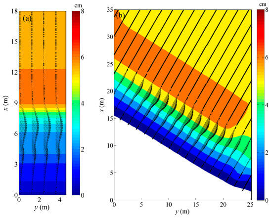 An average water level difference in the longshore direction formed during the experiment, resulting in circulation in the basin that was driven by the longshore current. This passive circulation system formed by the longshore current was situated in a closed harbor basin, which, when compared to an active circulation system, can only form a relatively uniform longshore current in the middle part of the beach’s topography. However, the advantage of this circulation system is that the longshore current is not affected by external artificial currents. Dalrymple [21] conducted a theoretical analysis and experimental measurements on this passive circulation system, and the results showed that a relatively uniform longshore current was formed in the middle part of the beach’s topography. Measuring a stable average longshore current distribution only requires that the longshore current be uniform in the middle part of the beach; for proof of the uniformity of longshore currents, refer to Yan et al. [10].