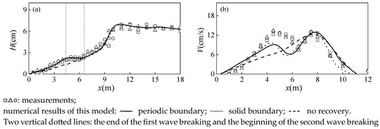 In order to verify the model, taking wave condition T1H3 as an example, Figure 8 shows a comparison of the wave height and longshore current velocity of different models with the experimental results. In Figure 8a, the first vertical dotted line represents the end of the first wave breaking and the beginning of the wave recovery area, and the second vertical dotted line represents the end of the wave recovery area and the beginning of the second breaking. The wave recovery area is located at x = 3.5 m–5.3 m. It can be seen from the figure that the calculation results under the two boundary conditions are consistent with the experimental results. This proves that the three contents of this model are as follows: (1) The judgment condition for the wave recovery (Equation (21)) is also suitable for the Boussinesq wave model here, which can be used to determine the location where the wave begins to recover. (2) It proves that the energy dissipation (Equation (22)) used in this model is suitable, as shown in Figure 8a. It can be seen that the wave height in the wave recovery zone tends to be constant; this is due to the dissipation of turbulence generated by wave breaking and the increase in wave height caused by wave shallowing due to the slope of the water bottom, which offset each other, resulting in a constant wave height in the wave recovery zone. (3) As shown in Figure 8, the calculation results of the first and second breaking points of waves in this model are in agreement with experimental results, indicating that Equations (19) and (20) used in this model can be used to determine the first wave breaking and determine new wave breaking occurring after the end of the wave recovery zone. The calculation results of both models are in good agreement with experimental results, and Figure 8a also shows the calculation results without wave recovery (calculated from the solid boundary), and it can be found that the wave height is continuously decaying, which is inconsistent with the experimental results. From Figure 8b, it can be seen that the distribution of longshore currents with wave recovery is bimodal, while the distribution of longshore currents without wave recovery is unimodal, which is also inconsistent with the experimental results.