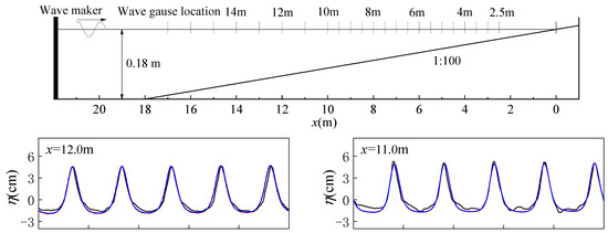 This section presents the two verifications of the established model: (1) validation for the judgment condition of wave recovery (21) and the modified wave breaking term (22); (2) validation of the applicability of the model to different incident wave heights. This is carried out by comparing the computational results of the present model with the experimental results. In addition, in order to illustrate the applicability of the model to different slopes, the calculation results of this model are compared with the computational results of the wave average model used by Yan et al. [10].