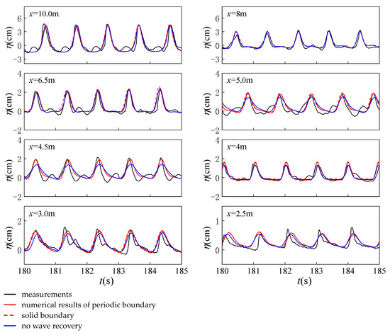 In order to further verify the model, more detailed results are given for the above case. Figure 9 shows the time series of free surface elevation at different locations. It can be seen from the figure that the model can reproduce the free surface elevation in different regions, including the unbreaking region, the first breaking region, the wave recovery region, and the second breaking region, which are similar to the experimental results in terms of time series. In the unbreaking region, the time series of free surface elevation at x = 12 m and 11 m are symmetrical, while in the first breaking region, at x = 10 m and 8 m, the wave front appears asymmetric. In the recovery region, at x = 6.5 m and 5 m, the wave returns to a symmetrical state, but in the second breaking region, at x = 3.0 m and 2.5 m, a significantly asymmetric wave front appears again. This reflects the fact that the model can reproduce the free surface variation during multiple wave breaking processes, further validating the model. It can also be seen from the figure that the calculation results of the two boundary conditions are relatively consistent. To illustrate the effectiveness of wave recovery, the free surface elevation without wave recovery is also shown in Figure 9. It can be seen that at x = 5.0 m, 4.5 m, and 3 m, the free surface elevation is less than the experimental results and numerical calculation results. Although there is a certain gap between the secondary peak of the numerical results and experimental results at the trough, it can be seen from the symmetrical shape of free surface elevation in numerical results that wave recovery in this model is effective.