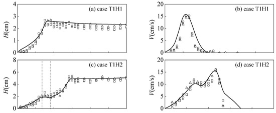 Before comparison, it is necessary to explain the selection of the cross-section for the calculation results. Taking wave condition T2H2 as an example, Figure 7 shows the distributions of wave height and time-averaged flow field. It can be seen from the figure that the calculation results under both boundary conditions exhibit stable longshore current velocities in the middle interval. Therefore, the computational results for the location in the middle of the shoreline were chosen for comparison with the experimental results.