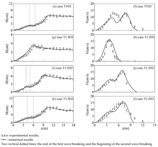 Figure 10 shows the comparison of the numerical results and experimental results for different incident wave heights. It can be seen from Figure 10a,g that the wave conditions with smaller incident wave heights only occur in the case of one wave breaking, and there is no wave recovery. This is because the ratio of wave height to water depth after wave breaking is an unsatisfactory judgment condition for wave recovery, as shown in Equation (21); therefore, there is no wave recovery for small wave heights. The longshore currents shown in Figure 10b,h have unimodal distributions, with the numerical simulation results being broader than the experimental results. For the cases with larger wave heights, it can be seen from the figure that the wave heights all show wave recovery, with a bimodal distribution being observed in the case of longshore currents. Comparing Figure 10c,e and Figure 10i,k, it can be seen that for the same wave period, the larger the wave height, the earlier the wave breaks, and the earlier the second breaking, the distance between the first and second breaking increases with increasing wave height. The distance to wave recovery increases with the increase in wave height, indicating that the distance to wave recovery is proportional to wave height. The calculated results are consistent with the experimental results. The distribution of longshore currents is slightly different from the experimental results. It can be seen from Figure 10d that at x = 8–9 m, the numerical results are broader than the experimental results in terms of longshore current distribution. Figure 10f shows that the secondary peak of the numerical results is smaller than the experimental results, while the main peak is consistent with the experimental results. Figure 10j shows that the numerical results are broader than the experimental results in terms of the longshore current distribution. Figure 10l shows that there is no obvious bimodal distribution in the experimental results, but there is a clear bimodal distribution in the numerical results. This is because one set of experimental results showed a trend towards a bimodal distribution but was covered by another set of results; therefore, there was no obvious bimodal distribution evident in the figure. The numerical results are narrower than the experimental results at x = 9–12 m; however, the overall trend is consistent.