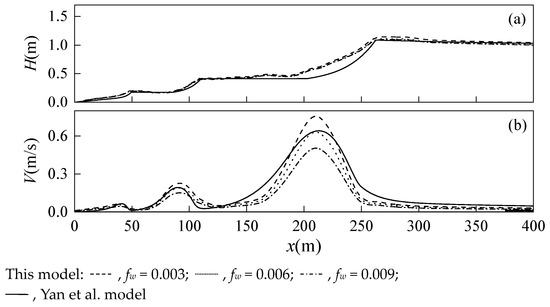 Distribution of wave height (a) and longshore current (b) for different bottom friction coefficients; Yan et al.: [10].