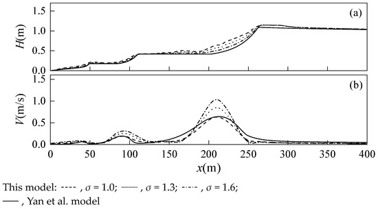 To address the issue of insufficient wave breaking intensity shown in Figure 11a, we discuss two parameters: the bottom friction coefficient and the wave breaking intensity coefficient . First, when , is set to 0.003, 0.006, and 0.009, respectively. Figure 12 shows the distributions of wave height and longshore current velocity for different bottom friction coefficients. It can be seen from the figure that the bottom friction coefficient has a small impact on wave height, and the longshore current velocity is inversely proportional to the bottom friction coefficient. When , is set to 1.0, 1.3, and 1.6, respectively. Figure 13 shows the distribution of wave height and longshore current velocity under different wave breaking intensity coefficients. It can be seen from the figure that as the breaking intensity coefficient increases, the attenuation after wave breaking also increases, and this also causes the longshore current velocity to increase. Therefore, by increasing the bottom friction and breaking strength coefficients, the calculation results of this model are closer to the results obtained by Yan et al. [10]. The above comparison with the calculation results of the model by Yan et al. [10] proves that this model is also applicable to the calculation of multiple wave breakings on different slopes. After comparison, here choose and . The case of gently sloping terrain with gradients of 1:300 and 1:500 is simulated below.