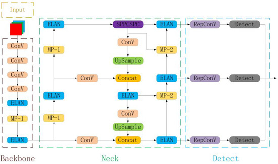 The model’s structure diagram of YOLOv7 is shown in Figure 1, which is divided into four parts, namely the input, backbone, neck, and output. Firstly, in the input section, the model performs preprocessing operations, such as data augmentation, on the dataset images, and feeds them into the backbone network. Secondly, the backbone network extracts features from the objects and fuses the extracted features with the neck network to obtain features of three sizes: large, medium, and small. Finally, the fused features are passed to the detection head, which generates the results.