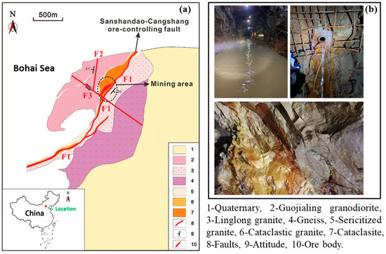 Geological map and underground environment of the Sanshandao gold mine. (a) Geological map, modified after [23]. (b) Underground environment.