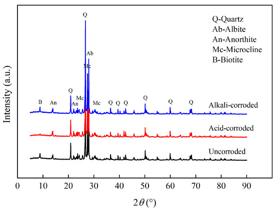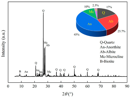 The granite specimens extracted from an intact rock block were processed into cylinders with a height of 100 mm and a diameter of 50 mm. Subsequently, specimens with similar densities and longitudinal wave velocities were selected to minimize potential errors. The XRD spectrum and main mineral components of the granite specimens are shown in Figure 2. The granite specimen is primarily composed of quartz (17.0%), anorthite (45.0%), albite (25.7%), microcline (10.0%), and biotite (2.3%). A common way to shorten the test period is by elevating the ion concentration of chemical solutions [33,34]. Therefore, the granite specimens were immersed in the prepared chemical solutions, which included a 10% HCl solution and a 10% NaOH solution. By monitoring the changes in the pH value of the solutions, it was determined that the granite had completely reacted with the solutions, and the immersion period was set to 48 days.