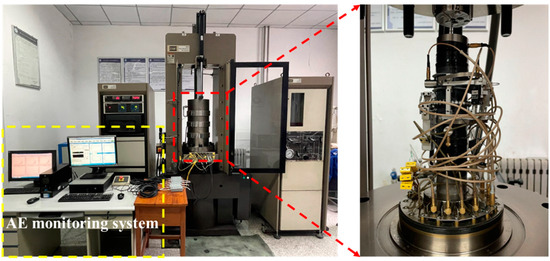 The soaked granite specimens were dried for 24 h to mitigate the influence of moisture content on the mechanical test results. Triaxial compression tests were conducted using the MTS 815 rock mechanics testing system, supplemented by the AE technique to monitor the signals generated by microfractures inside the specimen during loading, as shown in Figure 3. The loading process for the triaxial compression test was as follows: