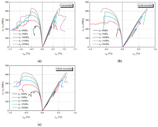 Deviatoric stress-strain curves under triaxial compression. (a) Uncorroded; (b) Acid-corroded; (c) Alkali-corroded.