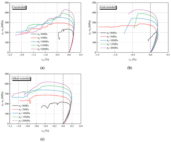 Deviatoric stress-volumetric strain curves under triaxial compression. (a) Uncorroded; (b) Acid-corroded; (c) Alkali-corroded.