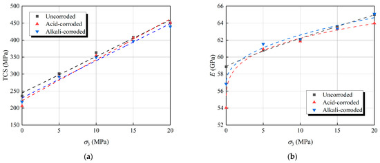 where , , and are the TCSs of the uncorroded, acid-corroded, and alkali-corroded specimens, respectively, MPa.