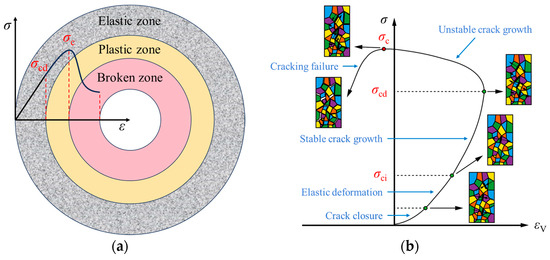 As shown in Figure 7, the fracture of rocks usually has progressivity, which can be characterized by the initiation, propagation, and coalescence of cracks, corresponding to different fracture zones in the surrounding rocks of the roadway [36,37]. In rock engineering, the most important concerns are crack initiation stress σci, crack damage stress σcd, and peak stress σc. Among them, σci and σcd are considered as the lower and upper limits of the long-term strength of the rock mass, respectively. This is of great significance for the stability evaluation of engineering rock masses. In general, the method for determining σcd is relatively objective. The widely accepted view is to consider the axial stress corresponding to the maximum volumetric strain in the axial stress-volumetric strain curve as σcd [38,39]. However, the determination of σci is challenging and highly subjective, mainly including the volumetric strain (VS) method, lateral strain (LS) method, lateral strain response (LSR) method, and AE method [40,41,42,43]. Among them, the LSR method is relatively more objective because the maximum value of the lateral strain difference in the axial stress-lateral strain difference curve is unique. Although the physical significance of this method is yet to be determined, it provides a convenient and objective method of obtaining σci. Therefore, this article obtained the σci and σcd of granite specimens based on the LSR method and axial stress-volumetric strain curve, respectively. The calculation results are shown in Table 1.