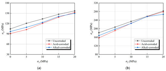The σci and σcd of granite specimens are approximately linearly positively correlated with confining pressure, as shown in Figure 8. Acid and alkali corrosion can reduce the σci and σcd, making the granite specimens more prone to crack growth or propagation. For example, the σci of the acid-corroded specimens and alkali-corroded specimens decreased by about 13% and 7%, respectively, compared to the uncorroded specimens under the unconfined condition. The σcd decreases in about the same proportion as the σci. However, this variability was progressively minimized as the confining pressure increased, suggesting that the confining pressure effect can mitigate the deterioration of the stress threshold by chemical corrosion to some extent.