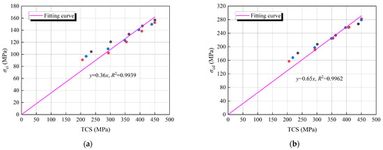 Confining pressure has a strengthening effect on the capability of anti-deformation of granite specimens. As the confining pressure increases, the TCS increases approximately linearly. Linear fitting was performed on the experimental data to obtain the fitting relationship between the TCS and confining pressure as follows: