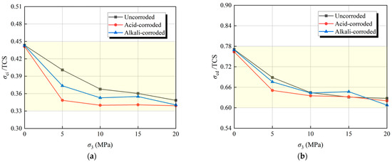 Variation in σci/TCS and σcd/TCS with confining pressure. (a) σci/TCS; (b) σcd/TCS.