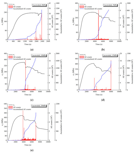 Time domain characteristics of AE counts of uncorroded granite specimens under different confining pressures. (a) 0 MPa; (b) 5 MPa; (c) 10 MPa; (d) 15 MPa; (e) 20 MPa.