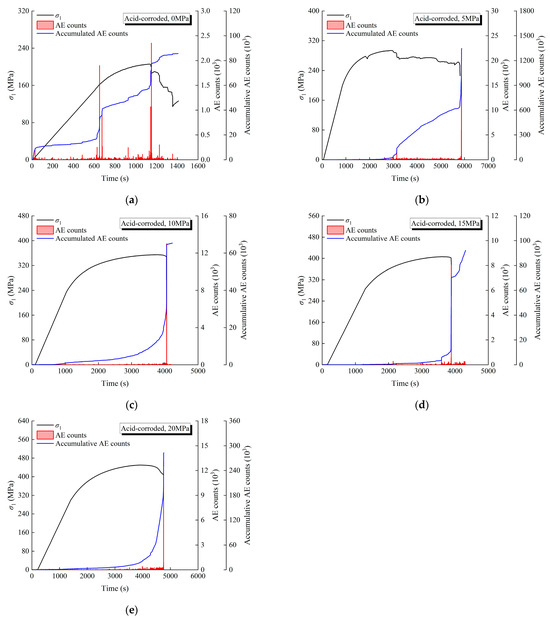 Time domain characteristics of AE counts of acid-corroded granite specimens under different confining pressures. (a) 0 MPa; (b) 5 MPa; (c) 10 MPa; (d) 15 MPa; (e) 20 MPa.