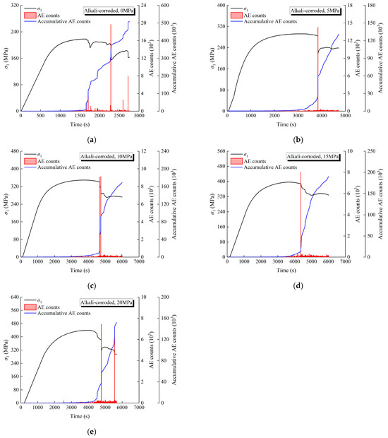 Time domain characteristics of AE counts of alkali-corroded granite specimens under different confining pressures. (a) 0 MPa; (b) 5 MPa; (c) 10 MPa; (d) 15 MPa; (e) 20 MPa.